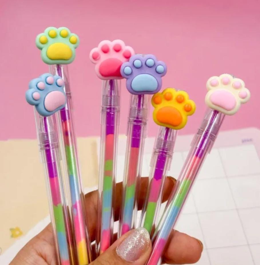 Caneta fofa patinhas com tinta coloridas,que vai descendo e mudando de cor confome vai usando . com biscuit de patinhas fofas na tampa